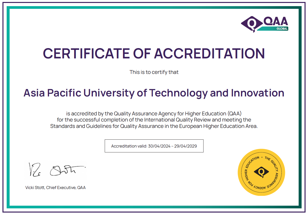 هذا الاعتماد (QAA) يضع معايير جامعة آسيا والمحيط الهادئ للتكنولوجيا والابتكار (APU) في مصاف 98٪ من الجامعات البريطانية الأعضاء في هيئة وكالة ضمان الجودة، مما يؤكد التزام الجامعة الراسخ بتقديم تعليم عالي المستوى. كما يُبرز هذا الاعتماد المكانة الدولية للجامعة، ويسلط الضوء على جهودها الحثيثة والمتواصلة لتحقيق الجودة الأكاديمية والابتكار.